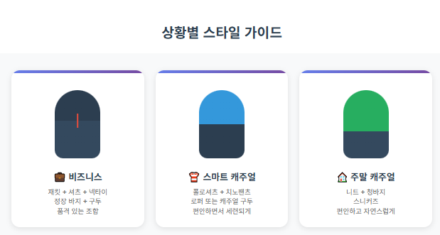 A: 잘 맞는 기본 셔츠 2-3벌과 네이비 재킷 1벌부터 시작하세요. 이 두 가지만으로도 다양한 코디가 가능합니다.